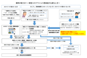 行政の指定する相談先や「帰国者・接触者相談センター」もしくは「かかりつけ医」に問い合わせをしましょう。医療機関を受診する際には、受診方法を電話等で確認しマスクを着用してから受診する。 なお居住地域により受診方法が異なるため、各自治体のホームページなどで確認をしてください。